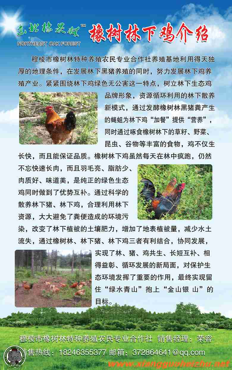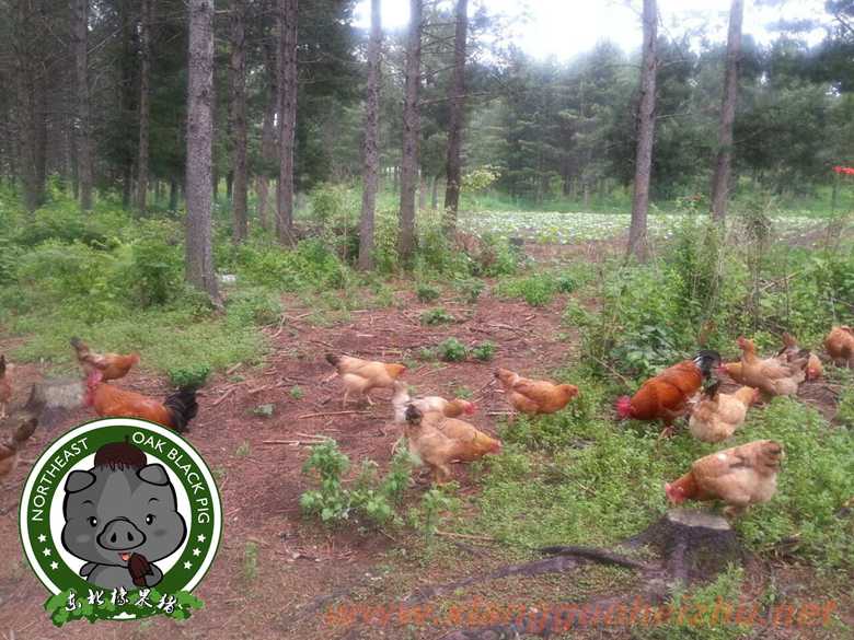穆棱橡树林黑猪养殖基地利用得天独厚的地理条件,在发展林下黑猪养殖的同时,努力发展林下鸡养殖产业,紧紧围绕林下鸡绿色无公害这一特点,树立林下生态鸡品牌形象,资源循环利用的林下散养新模式,通过发酵橡树林黑猪粪产生的蝇蛆为林下鸡“加餐”提供“营养”,同时通过啄食橡树林下的草籽、野菜、昆虫、谷物等丰富的食物,鸡不仅生长快,而且能保证品质。