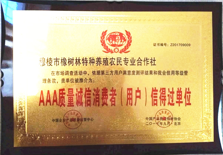 穆棱市橡果林特种养殖合作社被推介为“AAA质量诚信消费者信得过单位”