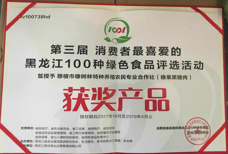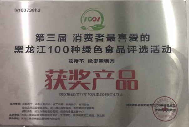 橡果黑猪肉荣第三届“消费者最喜爱的黑龙江100种绿色食品”获奖产品